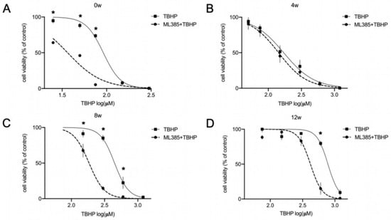 The upregulation of NRF2 pathway downstream targets, including NQO1 and TXNRD1 together with the clear indication for higher redox potential with neural maturation prompted us to investigate whether the NRF2 pathway is contributing to the observed increasing resistance to stress with differentiation. For this purpose, we inhibited NRF2 using the pharmacological inhibitor ML385, co-treated the cells with TBHP, and analyzed cell viability by ATPlite assay. For this analysis, we focused on undifferentiated lt-NES cells, immature (4 weeks), and mature (8 and 12 weeks) neural cultures. In accordance with the dynamic changes in NRF2 pathway activity during differentiation, we observed that the impact of this pathway on cell survival varies greatly between the different time points (Figure 3A–D). While TBHP exposure in the presence of the inhibitor clearly affected the viability of proliferative (Figure 3A) and 8 to 12-week-differentiated lt-NES cells (Figure 3C,D), the NRF2 pathway appeared not to contribute to the stress response in 4-week-old cultures (Figure 3B).