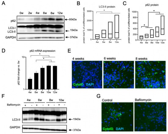 We focused on LC3-II and p62 as widely used markers for the assessment of the autophagic state in cells. LC3-II is formed after the proteolytic processing of full-length LC3 protein (‘LC3-I’) and its conjugation with phosphatidyl-ethanolamine (PE). By this modification, LC3-II is localized to isolation membranes and mature autophagosomes, and its relative amount directly reflects the number of autophagosomes. p62 (also known as Sequestosome 1, encoded by the SQSTM1 gene) is an important autophagic receptor protein that links cellular substrates to LC3 on the growing autophagosome [59]. P62 can be used to monitor autophagic activity as it mediates the selective degradation of cargo trapped within or bound to autophagosomes, including its own [60]. When we looked at the autophagic marker LC3-II, we found a prominent upregulation of the LC3-II protein levels starting at 4 weeks of differentiation with subsequent plateauing at 6–12 weeks (Figure 4A,B). P62 protein was also upregulated with an incremental increase with differentiation on both protein (Figure 4A,C) and mRNA level (Figure 4D). Next we wanted to investigate if the increase in the autophagic components LC3-II and p62 is associated with an upregulation in autophagic activity with differentiation. For this purpose, we used CytoID dye, which detects specifically active autophagosomes and autolysosomes. Indeed, we found an upregulation in the staining of active autophagic sites in lt-NES cells differentiated for 6 and 8 weeks (Figure 4E). We also confirmed activity of the lysosome-dependent degradation along differentiation using Bafilomycin, a V-ATPase inhibitor, which blocks the acidification and fusion of the autophagosomes with the lysosome, thereby resulting in accumulation of autophagosomes in cells. The autophagic flux level is represented by the difference in the amount of LC3-II (as a proxy for autophagosomal structures) between samples with or without Bafilomycin treatment. Indeed, blocking autophagosomal flux by Bafilomycin resulted in an accumulation of LC3-II protein (Figure 4F) in differentiating lt-NES cells and ablation of CytoID signal intensity (Figure 4G), confirming that autophagic flux is active. In addition, these data exclude the possibility that the increase in LC3-II and p62 is due to stalled autophagosomal turnover. Taken together, the increase in p62 transcript together with the upregulation of acidified autophagosomes indicates that there is a clear upregulation of both components of the autophagic machinery and autophagic flux after around 6 weeks of lt-NES differentiation.