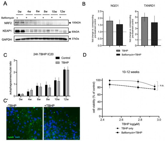 Autophagic flux does not contribute to the acute oxidative stress response in differentiating lt-NES cells. (A,B) Crosstalk between autophagy and KEAP1-NRF2 pathway regulation. (A) Western blot analysis of NRF2 and KEAP1 protein levels across lt-NES differentiation upon autophagic flux inhibition (by Bafilomycin) for 17 h. (B) NRF2 pathway downstream target gene expression under OS induction upon autophagic flux inhibition. lt-NES cells were differentiated for 10 weeks and pre-treated with Bafilomycin for 17 h, followed by addition of TBHP in the presence of Bafilomycin for 8 h. Cells were treated with TBHP only for 8 h as a control treatment. Expression of the NRF2 downstream target genes NQO1 and TXNRD1 was analyzed by qRT-PCR in order to analyze the effects on NRF2 pathway activation upon oxidative stress (TBHP) under basal conditions or during autophagy inhibition. Results are presented in comparison to the corresponding pre-treatment condition (Bafilomycin or pre-treatment control; equal to 1). Data are normalized to GAPDH mRNA levels and presented as means ± SEM (n = 4 per treatment condition). Significant difference between means for each treatment condition was determined by Student’s t test (NQO1 p = 0.5991; TXNRD1 p = 0.5257). (C) Autophagic flux response to 24 h TBHP IC20 treatment in lt-NES and lt-NES cultures differentiated up to 12 weeks quantified by CYTO-ID® staining shows that TBHP treatment does not induce upregulation of the autophagosomal flux. The autophagosomal load was assessed by calculating the ratio of autophagosomes to nuclei (n = 3, consisting of at least 3 technical replicates per treatment condition each). (C’) Representative CYTO-ID® staining images of 12-week-differentiated lt-NES cultures show no increase in autophagosomal load upon TBHP treatment. Nuclei were counterstained with DAPI. (D) ATPlite assay of pooled 10–12-week-differentiated lt-NES cells treated with TBHP with or without Bafilomycin. Cells were pre-treated with Bafilomycin for 17 h followed by a 24 h TBHP treatment. Cell viability was assessed at the end of the treatment by ATPlite assay. Results are presented as percentages relative to untreated cells (equal to 100%) ±SEM (n = 5, consisting of at least 3 technical replicates per treatment condition). Significance was assessed by two-way ANOVA (p = 0.89).
