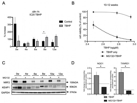 Considering these dynamic changes, we wondered whether the cells’ response to stress would be altered across differentiation. To test this hypothesis, we treated undifferentiated and differentiated (4 to 12 weeks) lt-NES cells for 24 h with different dosages of tert-butyl hydrogen peroxide (TBHP) as a model compound for OS induction. TBHP is a potent membrane-permeable oxidant which generates free radicals and causes lipid and protein peroxidation [51]. We found that with increasing neural differentiation lt-NES cells became more resistant to TBHP stress with a 2-fold increase in the TBHP concentrations necessary to reduce the cell viability by 50% in between 4 and 6 weeks and a 4-fold increase in between 6- and 10–12-week-old cultures (Figure 1D). This finding was underpinned by the IC20 and IC50 values determined via dose–response curve analysis (Table S1). Taken together, our data indicate that the transition of undifferentiated lt-NES cells to cultures composed of neurons and glia is characterized by an increased redox state and the ability to withstand oxidative stress, which is associated with changes in the cellular metabolic profile of the cultures.