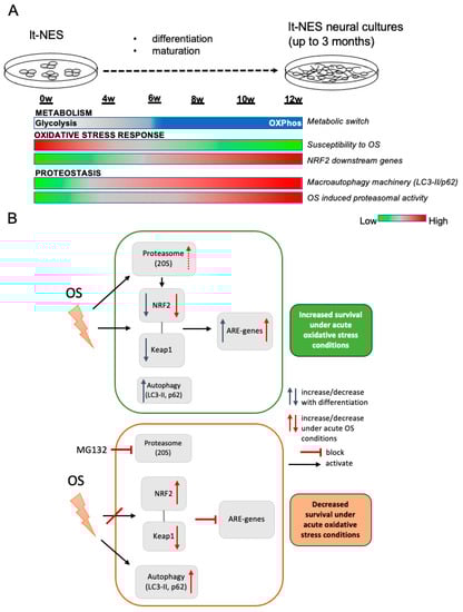 The following supporting information can be downloaded at https://www.mdpi.com/article/10.3390/cells11091388/s1, Figure S1: Characterization of long-term lt-NES cell differentiation, Figure S2: Metabolic changes across lt-NES cell differentiation, Figure S3: NRF2-downstream target gene expression, Figure S4: ML385 treatment leads to decrease in NRF2 protein levels and affects cell viability of proliferative lt-NES, Figure S5: Extended blockade of autophagic flux in differentiated lt-NES cells, Figure S6: Characterization of 20S related proteasomal subunit β5 expression along lt-NES cell differentiation, Figure S7: 20S activity can be blocked by MG132 treatment, Figure S8: Autophagy induction upon MG132 treatment, Figure S9: Quantification of Western blot data of KEAP1 protein levels in lt-NES cells differentiated for up to 12 weeks treated for 17 h with MG132, Figure S10: The proteasome is regulating KEAP1-NRF2 pathway activation under acute oxidative stress conditions also in lt-NES cells differentiated for 6 weeks. Table S1: Inhibition concentration 20 (IC20) and 50 (IC50) value estimation from dose–response curve analysis of 24 h TBHP treatment presented in Figure 1D, Table S2: Primers, Table S3: Antibodies and stains.