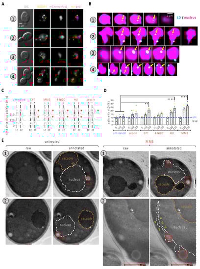 We then systematically assessed the percentage of cells bearing at least one nLD both in the untreated asynchronous population and in cells exposed for 120 and 210 min to a selection of genotoxins, each known to harm DNA differently. This included camptothecin (CPT), which traps the topoisomerase I on DNA after cutting one strand; the alkylating agent methylmetane sulfonate (MMS); the nucleotide-harming agent 4-nitroquinoline n-oxide, 4-NQO; the inhibitor of the synthesis of deoxynucleotides hydroxyurea, HU; and the radiomimetic agent zeocin. The effect of the treatments was apparent from the halt in cell cycle progression that we could observe upon cytometry analysis (Figure 1C, red asterisks). Although nLD are described as rare or absent in the WT strain [,], we observed a basal level of 10% of cells bearing at least one of them (Figure 1D). We observed a very modest and non-significant effect in the percentage of cells displaying nLD when cells were exposed to 4-NQO or zeocin (Figure 1D). These treatments had the property of arresting cell cycle progression at the G2 phase (Figure 1C). The addition of CPT, which creates damage at progressing forks during replication that are nevertheless processed later during G2 [], led to a mild yet significant increase in response to CPT (Figure 1C). As for the addition of HU or MMS, we observed a marked time-dependent accumulation of nLD in the cells (Figure 1D). Although they harm DNA through different mechanisms, HU and MMS both perturb the progression of replication forks and, as such, lead to the accumulation of cells within the S-phase of the cell cycle (Figure 1C). Of note, within those nuclei containing at least one LD, the mean number of LD (which was slightly above one in the untreated condition) did not significantly increase in response to any of the treatments (Figure S1A). Together, these observations suggest the following: (a) nLD induction is not a feature of DNA damage per se, but the birth of nLD is somehow more prone to occur during the replication phase of the cell cycle and/or during replication stress; (b) whatever underlies nLD formation in such situation(s) is spatially constrained.