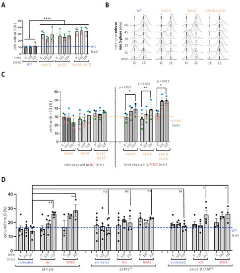 nLD occurrence in response to genetically induced replicative stress. (A) Exponentially growing cells of the indicated genotypes were imaged and the experimenter counted the percentage of cells displaying at least one LD in the nucleus (nLD). The measurement of the values at three different times in the absence of any treatment aims to assess whether time has any impact on the frequency of nLD. Each colored dot accounts for one independently performed experiment. Dots of the same color allow for the verification of a trend and the reproducibility in response to a given treatment. The bar heights represent the mean of those independent experiments, and the error bars account for the SEM. A multiple-comparison, one-way ANOVA was applied as indicated and the significance of the difference of the means is indicated by asterisks, where ****, p < 0.0001. At least 300 cells were counted per condition, time point and experiment. The level of the WT samples is provided for comparison, indicated by a blue dashed line. (B) Cytometry analysis of exponentially growing cells of the indicated genotypes that were collected either from asynchronous cultures (asyn.), or after a 2h30-long synchronization in G1 with alpha-factor, then allowed to progress into S-phase by removal of the alpha-factor block. 1C and 2C refer to the DNA content. Note that the double mutant sgs1∆exo1∆ could not be synchronized in this timeframe, since all cells remained accumulated in G2 throughout the experiment. This may relate to a high basal accumulation of stressed replication forks and/or accumulated DNA damage as a consequence of having undergone replication for many generations in the combined absence of these key proteins. (C) Identical set-up as in (A) but cells were exposed either to 100 mM HU or to 0.1% MMS for the indicated times. In this case, a t-test analysis was performed using the three means of each independent experiment to compare the potential difference of the means for each strain between its untreated and its 210 min treatment conditions. Only significant differences are indicated by p-values. At least 300 cells were counted per condition, time point and experiment. The level of the mutant samples is provided for comparison, indicated by an orange dashed line. (D) Cells grown until the exponential phase in medium selective for the indicated plasmids (pEmpty, no gene; pEXO1OE, to overexpress the nuclease Exo1; pexo1-D173AOE, to overexpress a nuclease-dead Exo1 protein) were treated as stated for the indicated times, imaged as in Figure 1A, and scored to determine the frequency of nLD in the population. At least five independent experiments were performed, each represented by a black dot. The bar heights represent the mean of those experiments, and the error bars account for the SEM. A multiple-comparison one-way ANOVA was applied as indicated and the significance of the difference of the means is shown by asterisks, where *, p < 0.05; **, p < 0.01. At least 300 cells were counted per condition, time point and experiment. The level of the WT samples is provided for comparison, indicated by a blue dashed line.