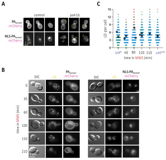 MMS treatment does not induce any apparent change in phosphatidic acid sub-cellular localization. (A) WT or cells lacking the phosphatidic acid (PA) phosphatase Pah1 were transformed with the indicated biosensors, aimed at detecting PA either all over the cell (PAsensor-mCherry), or specifically in the nucleus (NLS-PAsensor-mCherry). Three different examples of the patterns observed when imaging these cells are shown. Arrowheads point at deformed nuclear envelopes positive for the biosensor binding. (B) The exponentially growing WT cells described in (A) were exposed to 0.1% MMS for the indicated times and imaged to observe LD and the pattern yielded by the two PA biosensors. (C) WT cells treated with 0.1% MMS for the indicated times were stained with NileRed, and the total number of LD per cell scored. Three independent experiments were performed; each experiment is indicated by dots of a different color to allow reproducibility to be assessed []. The bigger, darker dots correspond to the mean of each of those independent experiments. At least 150 cells were counted per condition, time point and experiment.