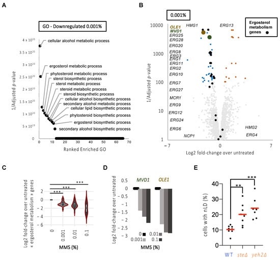 Our data therefore suggested that the increase of LD in the nucleus in response to replicative stress in general, and MMS in particular, may relate to a preferential increase in nLD exclusively from the INM. This is described as the consequence of an increase in the unsaturation degree of the nuclear membrane phospholipids, itself linked to the transcriptional upregulation of the desaturase Ole1 and of the sterol biosynthesis enzyme Mvd1 []. Of them, Ole1 is the only cellular enzyme capable of desaturating fatty acids and, given that there exists no opposing enzimatic activity, Ole1 half-life control is the only means of regulating unsaturation profiles in the cell []. We exploited publicly available transcriptomes of S. cerevisiae cells exposed for 1 h to increasing doses of MMS (0.001%, 0.01%, 0.1%) for which three biological replicates have been performed with high reproducibility ([] and Figure S1B). In agreement with [], exposure to MMS leads to transcriptomic alterations in a dose-dependent manner with an equivalent number of both downregulated and upregulated genes (Figure S1B–D and Tables S2–S4). Genes dysregulated upon 0.001% MMS were also dysregulated at 0.01% and 0.1% MMS, and were therefore considered highly responsive to MMS (Figure S1E). To document the pathways dysregulated in the presence of MMS, we ran a Gene Ontology (GO) analysis of downregulated or upregulated genes separately, and for each of the three doses of MMS (Figure 4A and Figure S1F,G).