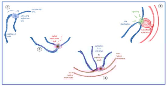 Are nLD therefore harmful, somehow accelerating the degeneration of the genome? Or are they simply a by-product, for example of the transcriptional changes that ensue upon loss of genome integrity? Or could it be that, under certain conditions that challenge the DNA, nLD are beneficial? We recently observed that invasion of the nuclear space by voluminous globular bodies of cytoplasmic origin, which at the same time constrict chromatin and provide additional nuclear membrane surface, correlate with a faster activation of the DNA damage response []. In the same line, we observe that an increase in the pool of phospholipids in contact with the nucleoplasm, for example nLD and nucleoplasmic reticulum arms, ensures a stronger DNA damage response activation that, importantly, translates into improved genome integrity []. Together, the emerging picture is that phospholipid-coated structures in the nucleoplasm may serve as nucleating platforms that, through their interaction with chromatin [], could launch DNA reactions. It has already been proposed that one of them is transcription modulation [,,]. We now propose that stalled replication forks relocated to the nuclear periphery stimulate, through their attachment, the formation of nLD. Their occupancy of the nucleoplasmic space would, in turn, serve to nucleate factors involved in the DNA damage response activation (Figure 5), thus having an impact on genome homeostasis and the cell’s ability to proliferate.