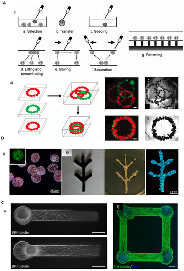 This method provides considerable flexibility in using different multicellular spheroids and controlling their relative proportion [54,55]. This characteristic might be advantageous for rapid and parallel tissue assembly but one of the major obstacles is the lack of flexibility for the creation of arbitrary pattern geometries, in particular when targeting complex or sparse 3D architectures.