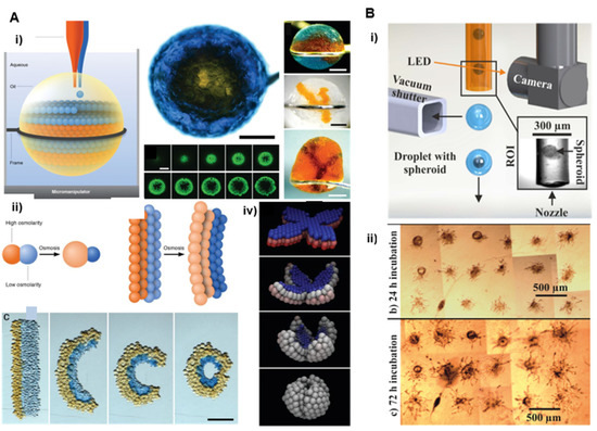 Figure 6. Droplet-based bioprinting. (A) Based on osmolarity gradients Reprinted with permission from Ref. [36]. Copyright 2013, The American Association for the Advancement of Science. (i) Droplet networks printed in bulk aqueous solution. The principle of aqueous droplets is dispensing into a drop of oil suspended in bulk aqueous solution (left side). Top view of a network printed in aqueous solution. A core of orange droplets is surrounded by a shell of blue droplets containing fluorescent pyranine (top middle). Confocal microscopy of the network in horizontal sections showing the fluorescent shell of droplets around the nonfluorescent core (bottom middle). Different types of networks printed in bulk aqueous solution (right side). Scale bars 400 μm. (ii) Principle of osmolarity gradients. (iii) Schematic of two droplets of different osmolarities joined by a lipid bilayer. The water flow through the bilayer causes the droplets to swell or shrink. (iv) Frames from a folding simulation of a network with a similar initial geometry Blue and red represent the lowest and highest initial osmolarities, respectively. White indicates the average of the two. (B) Single spheroid deposition setup Reprinted with permission from Ref. [37]. Copyright 2009, IOP Publishing: (i) Protruding transparent nozzle of a dispenser is primed with the spheroid solution. The generated droplet containing the spheroid can be dispensed onto a substrate if a spheroid is optically detected at the nozzle exit. If no single spheroid is detected, the droplet is aspirated by a vacuum shutter system. (ii) HUVEC spheroids were dispensed to defined positions and cultured for 24 h (top image) and 72 h (bottom image).