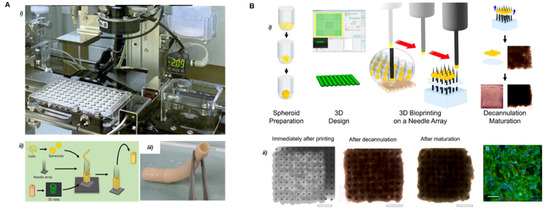 The use of removable scaffolds for the assembly of the multi-spheroid construct was first reported by Itoh et al. in 2015 [38]. This method is inspired by the Japanese traditional art Ikebana and uses arrays of needles as a temporary scaffold in which spheroids are immobilized by a robotic arm. This biomaterial-free method enables the accurate spatial organization of the spheroids or organoids in complex tissues analogs of practically any composition and organization [39,40,41]. The mechanical stability provided by the scaffold favors cell interaction, matrix secretion, and the formation of cohesive and functional tissue. The absence of biomaterials is also advantageous for implantation experiments, as it reduces the potential immune response. Itoh et al. used this method to produce models of the artificial aorta and implanted the resulting models in rats. The authors reported an endothelial network formation covering the inner surface of the tubular tissue after 5 days of implantation. Demonstrations of the printing and assembly of multicellular spheroids composed of human umbilical vein endothelial cells, human aortic smooth muscle cells, and human dermal fibroblasts were successfully achieved into scaffold-free small diameter tubular tissue (Figure 7A). This method provides a high accuracy thanks to the geometrical confinement permitted by the needle array. However, it imposes certain limitations regarding spheroid size to fit in the needle tip and gap between needles.