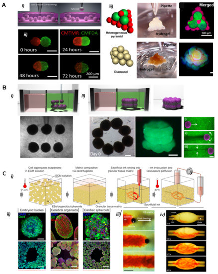 Figure 8. (A) Bioprinting of spheroids by a pressure-driven method Reprinted from Ref. [47]. (i) Illustration of the picking of individual spheroids by aspiration. (ii) Time-lapse images of the self-assembly process after bioprinting of 3T3 spheroids at different time points. (iii) Illustrations and micrographs of different shaped 3D printed structures with HUVEC and MSC spheroids represented in red and green, respectively. Dapi (blue) was used for staining of nucleus. (B) 3D bioprinting spheroids in supporting hydrogels Reprinted from Ref. [49]. (i) Spheroid deposition. (ii) Spheroid fusion in and removal of the structure from the gel after 4 days of culture. Scale bars 200 µm. (C) Sacrificial writing into a tissular matrix based on extrusion bioprinting Reprinted from Ref. [50]. (i) Illustration of the process. (ii) Examples of cellular construction for different OBB (organ building block) based matrices composed of embryoid bodies, cerebral organoids, and cardiac spheroids. (iii) Time-lapse of sacrificial ink (red) writing within a tissular matrix. (iv) Embedded 3D printing of a branched, hierarchical vascular network within a tissue matrix connected to inlet and outlet tubes, scale bar 10 mm.