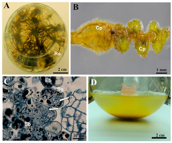 Callus induction and establishment of the cell suspension culture. (A) General view of root system of four-month-old axenic culture in jar. (B) Callus proliferation of root explant in the presence of 0.5 MS medium supplemented with 9.05 µM 2,4-D + 0.88 µM BAP and 2% sucrose after 6 weeks of culture. (C) Semi-thin section of callus showing small groups of cells containing nuclei in interphase, starch grains, and electron-dense bodies. Sections stained with toluidine blue (arrow). (D) General view of the conical flask containing the established cell suspension with yellow coloration of the medium. Cp—callus proliferation center; Eb—electron-dense body; N—nucleus; Rs—root system; Sg—starch grains.