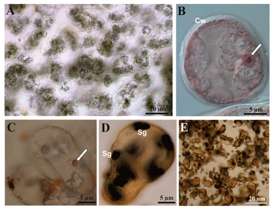 Cell suspension of C. smithii cultured in ½ MS medium supplemented with 9.05 µM 2,4-D + 0.88 µM BAP observed with Nomarski contrast. (A) General view of the cell aggregates. (B) Single cell with nucleus and distinct nucleoli stained with acetocarmine. (C) Lipid body (arrow) stained with Sudan III. (D) The cell showing numerous individual starch grains stained in black-blue coloration with in IKI. (E) Structure degradation of the ordered cell suspension by the subculture extension. Cw—cell wall, Sg—starch grains.