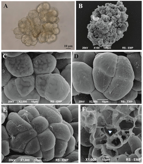Analysis of established, differentiated types of cell suspension with evidence of some degree of cell organization in the structure of the Cyathea smithii cell suspension cultured in ½ MS medium supplemented with 2,4-D and BAP. (A) Cell aggregates observed with Nomarski contrast (squashed specimen). (B) SEM image of cell aggregate. (C) A thin cell wall facilitates the observation of large intracellular bodies. (D) Example of regular cell divisions forming a four-celled cluster. (E) Multicellular cluster with one centrally located cell regenerated on the surface of the cell aggregate. (F) Cross-section of a regular cluster regenerated from the cell aggregate with a centrally located triangular cell (white triangle) surrounded by eight cells of various locations, shapes, and sizes. (A) Bright-Field Light Microscopy; (B–F). SEM images.