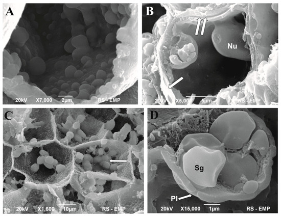 SEM image of the intracellular structure of cells of the Cyathea smithii cell aggregates. (A) An overview of the cell interior showing numerous organelles along the cell wall. (B) Cell wall (single arrow) and middle lamella (two arrows). (C) Globular cytoplasmic organelles (peroxisomes) associated with the cell wall or narrow bands of the cytoplasm. (D) Complex of starch grains surrounded by the cell wall with evident plasmodesmata. Pl—plasmodesmata; Nu—nucleus; Sg—starch grains.