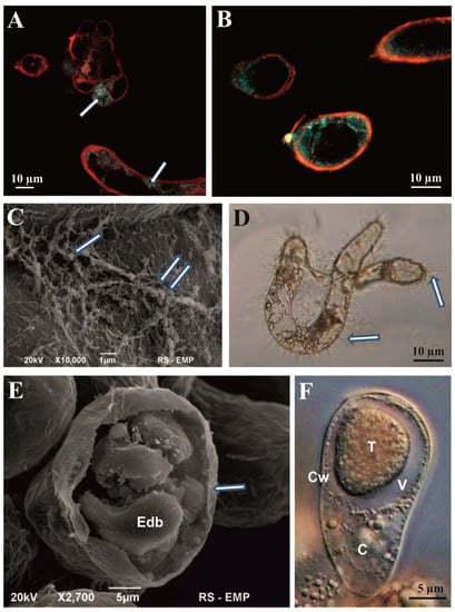 Structural evidence of the cell suspension metabolic activity. (A) Autofluorescence of small, actively dividing cells of the cell aggregate and of long differentiated cells; arrows show the condensation of tannins. (B) Autofluorescence of single cells. (C) Cell wall coated by a “net” or reticulum of granular (single arrow) and filamentous (double arrow) metabolites released by the cell. (D) Active production of metabolites by non-mitotically active cells (the transparent filaments) and their release outside the cell. (E) Opened marginal cell of aggregate in “cross-section” showing electron-dense bodies. (F) Large dense body located in a number of dense bodies. Cw—Cell wall; V—Vacuole; C—Cytoplasm; T—Body of tannins. (A,B)—confocal microscopy; (C,E)—scanning electron microscopy; (D,F)—light microscopy with Nomarski contrast (squashed specimen).