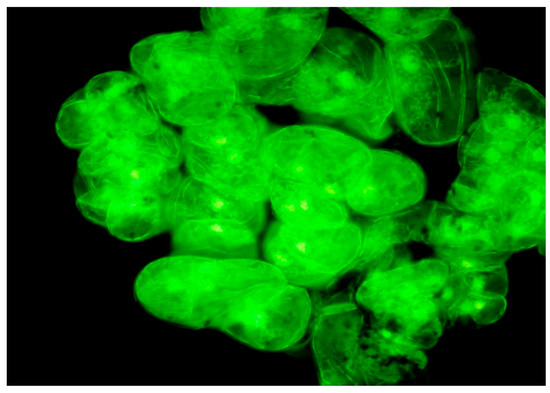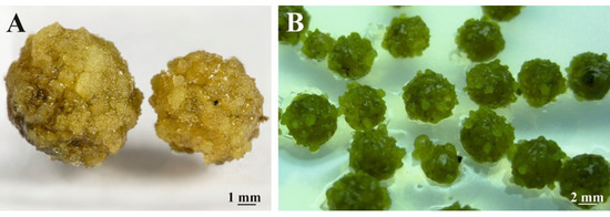 The genus Cyathea comprises over 470 species, which have seldom been used for in vitro culture and biotechnology experiments. The list includes the following species: Cyathea dregei [3], C. australis [4], C. capensis, C. cooperi, C. brownie, C. dealbata, C. dregei, C. leichhardtiana, C. robertsiana, C. schanschin, C. smithii [5], C. atrovirens [6,7], C. spinulosa [8,9], C. gigantea [10], and C. delgadii [11]. The last one of these recently became an experimental model for exploring somatic embryogenesis [12,13,14]. The vegetative propagation by spore germination and mass production of gametophyte clamps on agar medium has been described as a tool for the effective sporophyte production of 11 species of Cyathea [5]. The development of cell suspension cultures is an alternative route for plant regeneration. It has been successful in numerous seed plants, but there are only few reports for ferns, and none concern tree ferns. The sporophyte- or gametophyte-derived tissue callus was the plant material used for the establishment of these cell suspensions: Nephrolepis exaltata [15,16] and Platycerium coronarium [17]. In the cases of Platycerium bifurcatum [18,19] and Dryopteris affinis [20], specially designed experiments (based on the mechanical maceration of the leaf blade and different sizes of gametophytes, respectively) were conducted for the initiation of liquid cultures but not “classical” cell suspension.