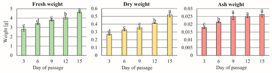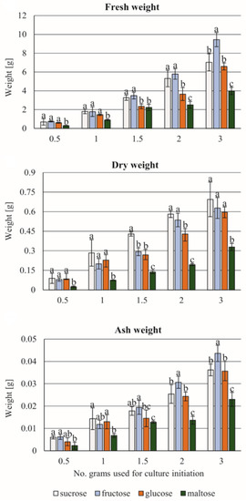 Figure 7 presents the kinetic of standard growth of C. smithii cell suspension as the main source of the cells used in other programs of experiments. The response of the cultured cell suspension was strongly correlated with the fresh mass of its initiating sample. The highest values were obtained for 3.0 g tissue for all studied saccharides, with fructose the best (Figure 8). When comparing fresh and dry masses and ash, the ratios of these parameters were almost 10 and 100 times smaller, respectively. The studied saccharides sample of 3.0 g tissue appeared optimal for all three studied parameters. Among the studied saccharides, there were significant differences between both disaccharides, especially for sucrose and maltose content. For monosaccharides, fructose stimulated the growth of all studied parameters better than glucose. The most intensive growth of parameters was observed in the cases of sucrose and fructose.