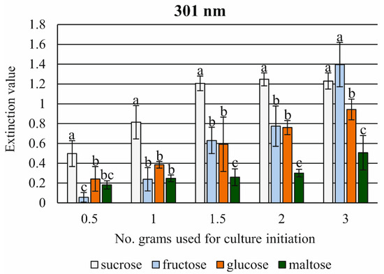 Production of the flavonoid quercetin with the wavelength 301 nm was correlated to the source of C-organics and the initial weight of tissue. In general, the value of the extinction parameter showed a constant increase correlated with the initial weight of tissue and used sugars. In the case of sucrose, the extinction parameter appeared to be optimal for 1.5 to 3.0 g of the initial mass of cultured cells. However, the highest extinction value was obtained for medium supplemented with fructose in the presence of 3.0 g of tissue initiating the culture (Figure 10). The suspension cultured in the presence of maltose showed the lowest level of extinction for all tissue weight parameters studied. In the presence of maltose, the tissue showed a 2.5-fold lower value than the optimal value shown by fructose.