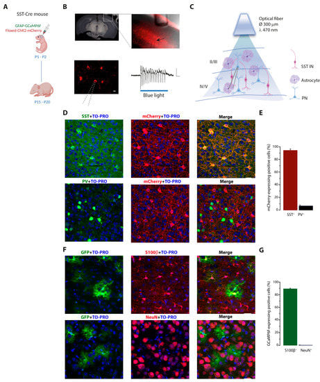 - Mariotti, L.; Losi, G.; Lia, A.; Melone, M.; Chiavegato, A.; Gómez-Gonzalo, M.; Sessolo, M.; Bovetti, S.; Forli, A.; Zonta, M.; et al. Interneuron-specific signaling evokes distinctive somatostatin-mediated responses in adult cortical astrocytes. Nat. Commun. 2018, 9, 82. [Google Scholar] [CrossRef]