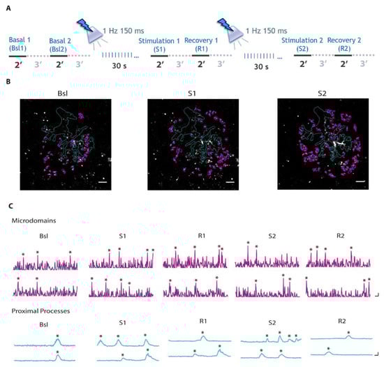 It is known that cytosolic Ca2+ elevation at the soma is an indicator of astrocytic responsiveness to episodes of intense neuronal activity, leading to the idea that astrocytes can detect information deriving from intense neuronal activity, while failing to detect low levels of synaptic activity []. However, recent studies that used genetically encoded Ca2+ indicators (GECIs) revealed an impressive complexity of changes in Ca2+ dynamics, spatially localized at fine astrocytic processes, including perisynaptic astrocytic processes (PAPs), the so-called “microdomains” []. Microdomains may exhibit Ca2+ elevations as fast as elevations observed in neurons [] and they have been proposed to integrate the activity of several individual synapses. However, the mechanisms that regulate Ca2+ dynamics in microdomains and their relationship to receptor-mediated Ca2+ responses to neurotransmitters remain poorly defined.