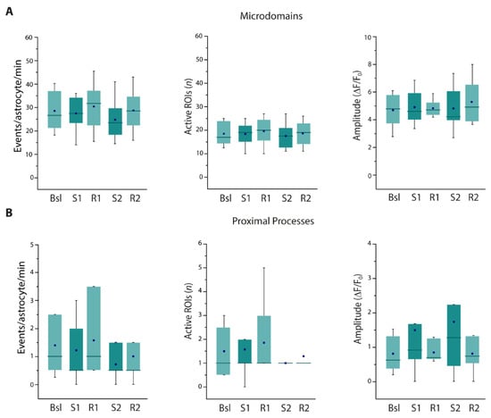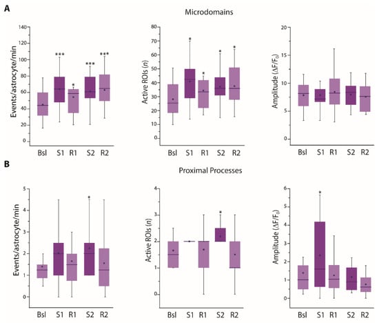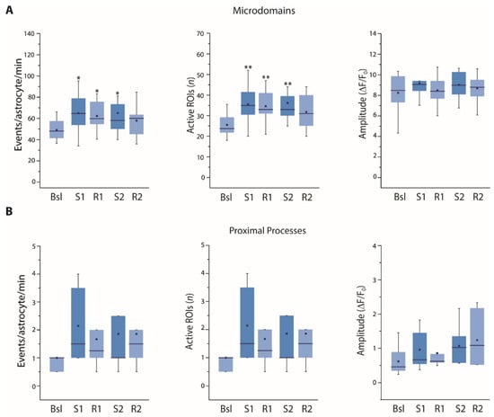 Basically, this procedure combines a threshold measured from the global baseline with a stricter threshold computed from a local baseline. We adopted this method to reduce artefacts from the recording noise superimposed on the slow astrocytic Ca2+ dynamics and from slow changes in the baseline due to physiological or imaging drifts. All Ca2+ traces were visually inspected to exclude the ROIs dominated by noise. To quantify the overall microdomain and proximal process activity per astrocyte, the mean amplitude of Ca2+ events, the number of active ROIs, and the frequency of Ca2+ events per cell were measured under different experimental conditions (basal (bsl), stimulation 1 (S1), recovery 1 (R1), stimulation 2 (S2), and recovery 2 (R2)). Basal values were obtained by calculating the mean values for the different parameters from two basal recordings. To identify the conditions (S1, R1, S2, and R2) that differed from the basal condition (bsl), depending on the normality of the data, we used one-way repeated measures ANOVA with a post hoc Holm-Sidak test or one-way repeated measures ANOVA on ranks with Dunnett’s test.
