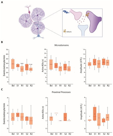 The glial cell astrocytes exert key roles in brain functions, from the regulation of synaptic transmission to the control of neurovascular coupling and behavioral responses [,,,]. Over the last three decades, accumulating evidence shows that astrocytes express a large variety of membrane receptors that sense extracellular signals, including neurotransmitters such as glutamate, adenosine, norepinephrine, γ-aminobutyric acid (GABA), histamine, adenosine triphosphate (ATP), and acetylcholine [,,,]. Activation of astrocytic metabotropic or ionotropic receptors by neuronal signals results in complex changes in cytosolic Ca2+ levels in astrocytes that ultimately trigger the release of various gliotransmitters, contributing to synaptic transmission modulation [,]. Although the role of astrocytes at GABAergic synapses has not been thoroughly investigated, a growing body of evidence is highlighting the importance and the circuit-specific complexity of astrocyte-interneuron communication [,,,,,,,,,,].