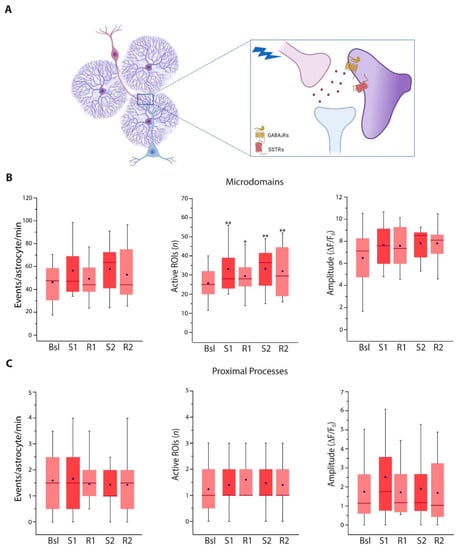 We next explored whether the release of somatostatin by SST interneurons is involved in the astrocytic Ca2+ response, as we previously reported in the SSCx []. With this aim, we performed experiments in the presence of the specific SSTR antagonist CYN 15406 (1 µM). We observed that in the presence of CYN15406, SST interneuron activation induced a significant increase in the overall number of active microdomains, while the increase in the Ca2+ event frequency at microdomains, immediately after the SST stimulation did not reach statistical significance (Figure 6A–C). The effect of CYN 15406 was even more pronounced at the level of the proximal processes, where no statistically significant responses were observed after SST interneuron stimulation (Figure 6B). Taken together, these results suggest that the neuropeptide SST contributes to the Ca2+ response in astrocytes evoked by SST interneuron stimulation.
