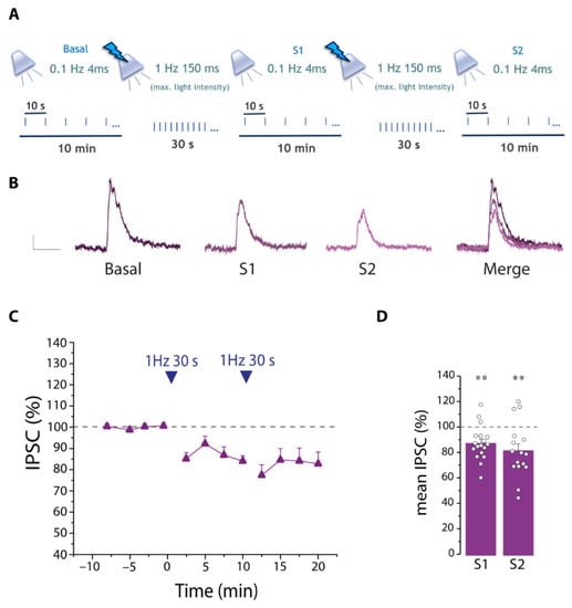 Intense stimulation of SST interneurons decreases the amplitude of inhibitory currents on PNs. (A) Schematic of the protocol for IPSC recordings in PNs and stimulation of SST interneurons. (B) Representative evoked IPSCs before (basal) and after the first (S1) and the second (S2) 30 light pulses and merger of all IPSCs. Scale bar, 50 ms, 10 pA. (C) Time course of the mean normalized IPSC amplitude before and after the 30 light pulse stimulations (n = 18). In this figure and the other figures reporting IPSCs amplitude vs time, t = 0 indicates the end of the first 30 pulse stimulation. (D) Quantification of the mean normalized IPSC amplitude during 10 min after the first (S1) and second (S2) stimulation. Note that an intense stimulation of SST interneurons disinhibits PNs. * statistical comparison with basal conditions, ** p < 0.01, paired t-test.