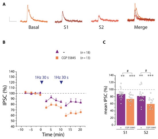 Blocking GABABRs induces a stronger disinhibition of PNs. (A) Representative IPSCs before (basal) and after the first (S1) and the second (S2) 30 light pulses and merger of all IPSCs, in the presence of the GABABR antagonist CCP 55845. Scale bar, 50 ms, 10 pA. (B) Mean normalized IPSCs amplitude before and after the 30 light pulse stimulation in the presence of CGP 55845 (n = 13) (C) Quantification of the mean normalized IPSC amplitude during the 10 min after the first (S1) and second (S2) stimulation in the absence or presence of CGP55845. Note the increased disinhibition after blocking GABABRs. * statistical comparison with basal conditions, ** p < 0.01, *** p < 0.001, paired t-test. # statistical comparison in the absence and presence of antagonist, # p < 0.05, unpaired t-test. Note also that in this figure and the other figures reporting IPSC amplitudes in the presence of antagonists, the control values reported in Figure 7 have been plotted again to facilitate the comparison of PNs disinhibition in the absence and presence of antagonists.