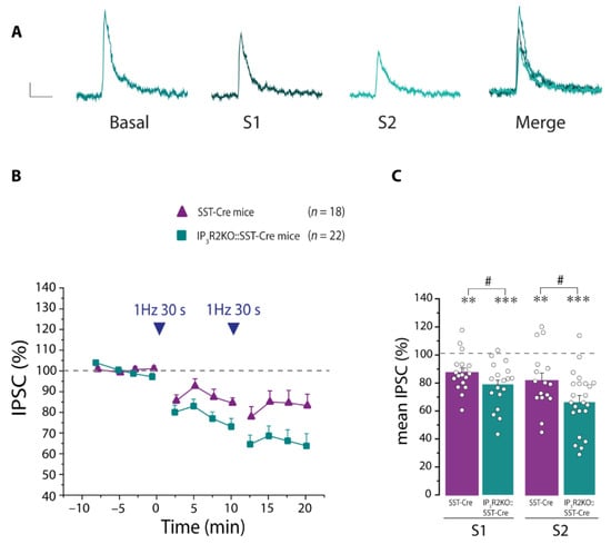 IP3R2-mediated signaling pathway counterbalances disinhibition of PNs. (A) Representative IPSCs before (basal) and after the first (S1) and the second (S2) 30 light pulses and merger of all IPSCs, in an IP3R2KO::SST-Cre mouse. Scale bar, 50 ms, 10 pA. (B) Mean normalized IPSCs amplitude before and after the 30 light pulse stimulation in the IP3R2KO::SST-Cre mice (n = 22). (C) Quantification of the mean normalized IPSC amplitude during the 10 min after the first (S1) and second (S2) stimulation in the IP3R2KO::SST-Cre mice. Note that in IP3R2KO::SST-Cre mice the disinhibition of PNs is stronger compared to that observed in SST-Cre mice. * statistical comparison with basal conditions, ** p < 0.01, *** p < 0.001, paired t-test. # statistical comparison with values in SST-Cre mice, # p < 0.05, unpaired t-test.