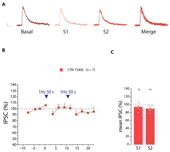 SST receptors participate to the mechanism of disinhibition of PNs. (A) Representative IPSCs recorded in the presence of the SSTRs antagonist CYN 15406, before (basal) and after the first (S1) and the second (S2) 30 light pulse stimulations. Scale bar 50 ms, 10 pA. (B) IPSCs amplitude before and after the 30 light pulse stimulation in the presence of the SSTR antagonist CYN 15406 (n = 7). (C) Quantification of the disinhibition of PNs after the first (S1) and second (S2) stimulations, in the absence and presence of CYN 15406. Note that in the presence of CYN 15406, an intense stimulation of SST interneurons does not decrease significantly the inhibitory currents on PNs. Statistical comparison with basal conditions, ns, not significant, paired t-test.