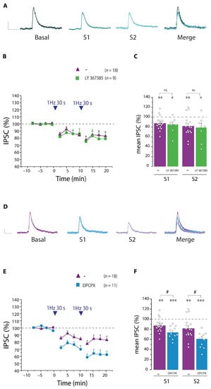The release of astrocytic glutamate has been extensively shown to modulate excitatory synaptic transmission through the activation of presynaptic metabotropic mGluR1 [,,,,]. Therefore, we investigated whether the gliotransmitter glutamate could contribute to the modulation of SST interneurons signaling to PNs. We found that in the presence of the mGluR1 antagonist LY 367385 (100 µM), the disinhibition of PNs triggered by an intense stimulation of SST interneurons was unchanged (Figure 11A–C). Adenosine acts on either pre- or postsynaptic adenosine receptors, decreasing or enhancing synaptic transmission [,,]. We then investigated the possible involvement of astrocytic ATP release, which is rapidly degraded to adenosine by membrane-bound ecto-nucleotidases. Thus, we performed experiments in the presence of the selective antagonist of A1Rs DPCPX (1 µM) and found that after both the first and the second SST interneuron stimulation, the IPSC amplitudes were further decreased (Figure 11D–F), suggesting that activation of A1R favors an increase in IPSC amplitude that counterbalances the disinhibition of PNs.