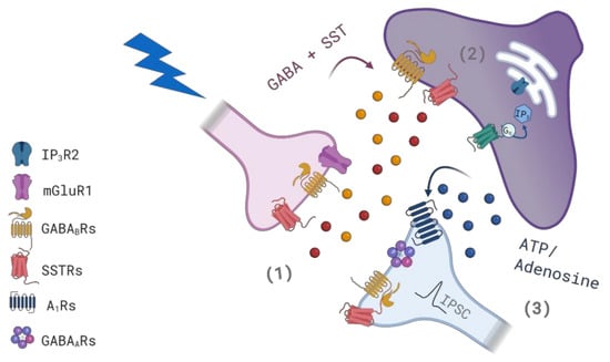 Schematic of the proposed cellular and molecular mechanism for IPSC amplitude modulation after SST interneuron hyperactivity. (1) An intense stimulation of SST interneurons in the VCx induces the release of GABA and somatostatin that, through activation of neuronal SSTRs, induces a reduction of IPSC amplitude in PNs, i.e., disinhibition of PNs. (2) Simultaneous activation of GABABRs in astrocytes triggers IP3R2-mediated Ca2+ elevations that are modulated by activation of astrocytic SSTRs. (3) Astrocytes release ATP/adenosine that by activating A1Rs, probably postsynaptic, favors an increase in IPSC amplitude that counterbalances the disinhibition of PNs.