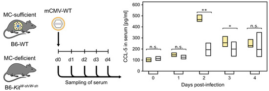 Our previous study, comparing acute, primary mCMV infection in MC-competent C57BL/6 (B6) wild-type mice and MC-deficient mutants C57BL/6 (B6)-KitW-sh/W-sh (briefly sash mutants) [72], showed a strong MC-dependent wave of serum CCL-5 peaking on day two, post-infection (Figure 1, [73]). CCL-5 is not contained in MC granules and, thus, its release requires new synthesis [3].