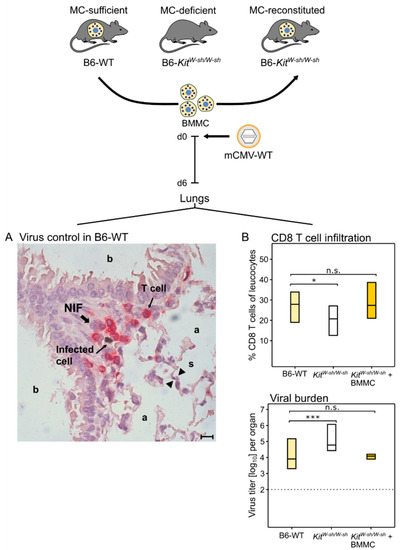 NIF consist primarily of tissue-infiltrating CD8 T cells that are not distributed randomly but cluster around infected cells [63] depending on the presentation of cognate viral epitopes [74,75]. Lung infiltration by CD8 T cells and lung infection were found to be inversely correlated (Figure 2B, [73]), reflecting the fact that CD8 T cells represent the antiviral effector cells in pulmonary infiltrates [61,62,63]. Specifically, a role for MC was shown by reduced pulmonary CD8 T-cell infiltration corresponding to reduced control of pulmonary infection in MC-deficient sash mutants compared with MC-competent B6-WT (wild-type) mice. Importantly, lung infiltration by CD8 T cells and control of infection were restored when MC-deficiency was reversed by the reconstitution of sash mice with bone-marrow-derived MC (BMMC) from B6-WT donors (Figure 2B, [73]).