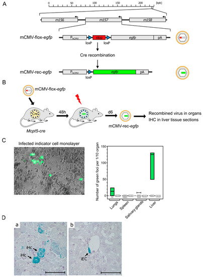 To identify and quantitate infectious mCMV-rec-egfp, organ homogenates were plated on monolayers of permissive mouse embryo fibroblasts as indicator cells and, after a period in cell culture, indicator cells expressing the reporter protein eGFP were counted (Figure 3C) [80]. The finding that the liver was the predominant source of the recombined virus is explained by the fact that the hepatocyte is the major virus-producing cell type during acute mCMV infection [78]. The existence of green-fluorescent indicator cells proved that mCMV-flox-egfp was recombined in MC, and that the viral replication cycle has proceeded within MC to the assembly of infectious mCMV-rec-egfp virions.