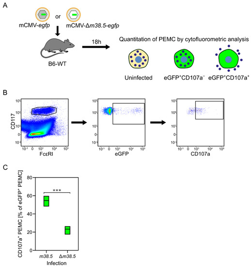 MC degranulation triggered by the anti-apoptotic mCMV protein vMIA-m38.5. (A) Sketch of the experimental protocol. C57BL/6 mice were infected intraperitoneally with mCMV recombinants containing (grey-shaded capsid) or lacking (empty capsid) gene m38.5. Both virus genomes include gene egfp coding for the fluorescent reporter protein eGFP (green) that identifies infected MC. Peritoneal exudate MC (PEMC) were isolated from the peritoneal cavity 18 hours (h) after infection. (B) Gating strategy for cytofluorometric analysis identifying CD117+FcεR1+ PEMC that either have remained uninfected (eGFP−) or were infected but have not, or not yet, degranulated (eGFP+CD107a−), or were infected and have already degranulated (eGFP+CD107a+). (C) Relative quantitation of infected eGFP+CD117+FcεRI+CD107a+ PEMC degranulated after infection with either mCMV-egfp expressing vMIA-m38.5 or deletion mutant mCMV-Δm36.5-egfp. Green bars represent range of data from individual mice, with median values marked. (***) highly significant with p < 0.001. Results are displayed graphically modified and in a new arrangement, based on original data published in [77].
