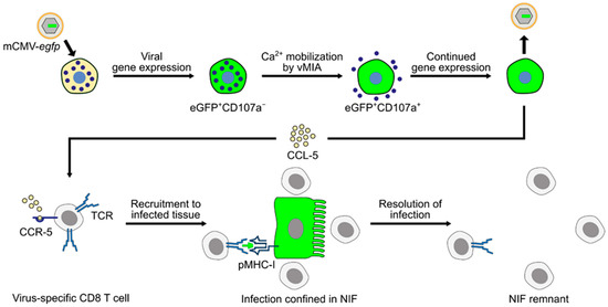 Graphical abstract summarizing the current knowledge regarding the role of MC in controlling CMV infection in the mouse model of CMV disease. Reporter protein eGFP (green color) is used to indicate infection. (TCR) T-cell receptor; (pMHC-I) MHC class-I molecule presenting viral peptide to cognate CD8 T cells; (NIF) nodular inflammatory focus; and (vMIA) viral mitochondria-localized inhibitor of apoptosis.