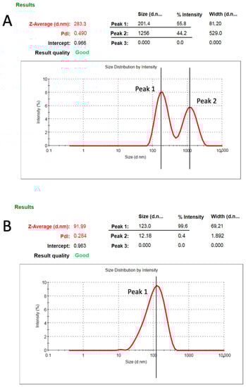 The culture medium collected after a 24 h incubation of the cell line in serum-free medium was found to contain a population of large EVs (peak 1 at 201.4 nm and peak 2 at 1256 nm in diameter, isolate at 15,000× g; Figure 2A) and small EVs (peak 1 at 123 nm in diameter, isolated at 110,000× g; Figure 2B).