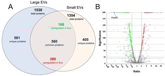 (A) Venn diagram showing the identified proteins (unique, common, and up-/down-regulated) between large extracellular vesicles (EVs) and small EVs. (B) Volcano plot of significant proteins differentially expressed between large EVs and small EVs. The X axis represents the fold change of differentially accumulated proteins represented with the ratio (large/small EVs), and the Y axis represents the corresponding significance. Fold change ≥ 2 and t-test with a p < 0.05 were set as the significance threshold for differential expression. Green represents downregulated proteins, and red represents upregulated proteins (large EVs/small EVs).