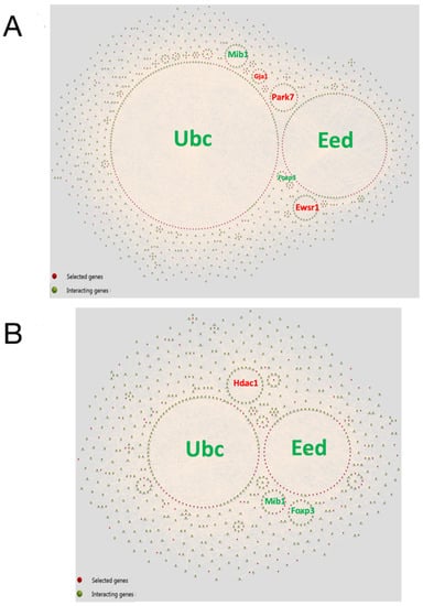 To investigate the overall proteomic composition of large and small EVs, the identified proteins were categorised using FunRich and subjected to a gene interaction network analysis (Figure 5A,B). Proteins identified in small and large EVs were significantly associated with ubiquitin (Ubc), EED, E3 ubiquitin ligase MIB1 (Mib), and forkhead box protein P3 proteins. Significant associations with protein/nucleic acid deglycase DJ-1 (Park7), RNA-binding protein EWS (Ewsr1), and gap junction alpha-1 protein (Gja1) were found for proteins identified in large EVs. In contrast, a significant association with Hdac1 was found for proteins identified in small EVs.