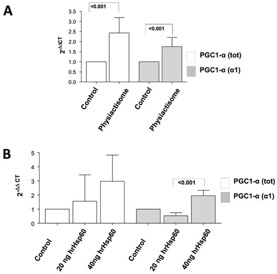Physiactisome was able to significantly induce the expression of total PGC-1α, as well as that of the PGC-1α isoform 1 at the transcript level (Figure 6A). This experiment suggested that Hsp60 was responsible for the observed effects of Physiactisome, as it contained high levels of Hsp60.