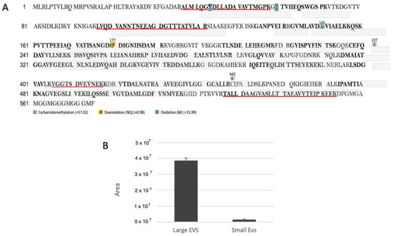 (A) Sequence coverage map of Hsp60 (UniProt accession no., P63038) obtained by tryptic digestion and nUHPLC/HR nESI-MS/MS. Peptides identified in the extracellular vesicle (EV) samples are shown in bold; peptides identified in the small EVs sample are underlined. (B) Quantification of Hsp60 levels between large and small EVs.