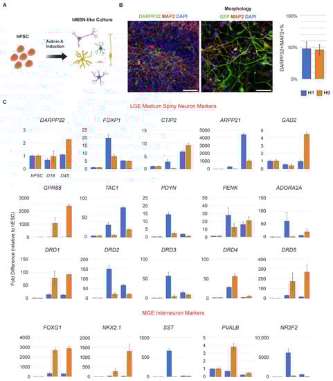 We differentiated male (H1) and female (H9) human embryonic stem cells with an Activin A induction protocol (Figure 1A) []. After 45 days (DIV 45), hMSN-like cells were immunostained and found to express DARPP32 and MAP2, the stereotypical markers of striatal MSNs and neurons, respectively (Figure 1B, Table S1). Additionally, hMSN-like cells differentiated into neurons that were 47.8% and 45.9% DARPP32+ in H1 and H9, respectively (Figure 1B). QRT-PCR at days 16 and 45 showed that hMSN-like cells also expressed other general markers of lateral ganglionic eminence MSNs including FOXP1, CTIP2, and ARPP21 (Figure 1C, Table S2). MSNs are often classified into two main subtypes: dopamine receptor D1-like and D2-like receptor-expressing MSNs [,]. We identified the markers of both D1 (i.e., DRD1, TAC1, PDYN) and D2 (i.e., DRD2, PENK, A2A) MSNs. As expected, hMSN-like cells also expressed acetylcholine (e.g., CHRM1) and glutamate receptors (e.g., GRIA1, GRIN1) (Figure S1) []. hMSN-like cells also expressed genes characteristic of medial ganglionic eminence interneurons (i.e., NKX2.1) (Figure 1C).