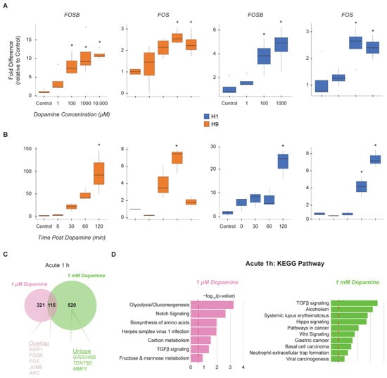 hMSN-like cells exhibit dose and time-dependent responses to dopamine. (A) QRT-PCR of RNA isolated from DIV45 H1 and H9 hMSN-like cells 1 h after exposure to different dopamine concentrations (1 µM to 10 mM) and analyzed for FOSB and FOS. (B) QRT-PCR of RNA isolated from DIV 45 H1 and H9 hMSN-like cells 0 to 120 min after exposure to 1 mM dopamine and analyzed for FOSB and FOS. (A,B) For QRT-PCR, values were normalized to GUSB mRNA levels in the same samples and expressed as a fold change in dopamine versus PBS control cultures. * = p < 0.05; One-way ANOVA. n = 3–4 independent replicates and 2 technical replicates. (C) Venn Diagram showing the number of shared differentially expressed genes (DEG) between DIV45 hMSN-like cells quantified by RNA-seq 1 hour after acute 1 μM and 1 mM dopamine. (D) Functional enrichment analysis of RNA-seq data for KEGG pathways of DEGs unique to DIV45 1 μM dopamine dosed (left) and 1 mM dosed (right) hMSN-like cells. Significance is represented by Log10-transformed p-values. Dotted red line indicates p-value of 0.05. (C,D) DEGs were identified by max group mean ≥ 0.75, FDR p-value < 0.05, and Log2(Fold Change) > |1|. Differential expression was performed against PBS control group using the Wald test. n = 3 independent replicates.