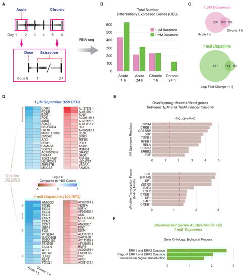 A key physiological response to substances of abuse is desensitization at the cellular level. The chronic dosage or self-administration of substances of abuse in rodents leads to a unique molecular phenotype known as gene desensitization [,,], in which differentially expressed genes (DEG) reduce in magnitude of expression when compared to a single acute exposure. To assess if this important response also occurs in hMSN-like cells, we acutely (DIV45) or chronically (DIV50) dosed hMSN-like cells with dopamine, extracted RNA at 1 h or 24 h after the last dose, and performed RNA-seq (Figure 3 and Figure S3). As both the 1 µM and 1 mM concentrations elicited gene expression responses but to distinct degrees (Figure 2A) and it remains unclear what concentration is truly physiological, we tested both. Importantly, at both concentrations, chronic dosing led to a dramatic reduction in the number of DEGs compared to single acute doses (Figure 3B). As expected, the number of DEGs decreased when sampling at 24 h versus 1 h after the last dopamine exposure, although a substantial number of DEGs remained (see Dataset S1–S4). To identify whether the same set of genes was responding to both acute and chronic dosing, we compared DEGs across conditions and observed that 50–60% of the chronically dosed hMSN-like cell DEGs were also differentially expressed after acute dosing (Figure 3C). This was true for both concentrations. However, although the overall number of DEGs decreased, this did not mean that individual genes were necessarily desensitizing. Therefore, we narrowed our analysis to identify the desensitized genes. To do this, we ratioed the gene expression changes of acute 1 h hMSN-like cells to chronic 1 h hMSN-like cells and did so for 1 µM and 1 mM dopamine conditions separately. Desensitized genes were defined as those with a ratio > |1.1| as previously defined []. In general, the 1 mM dopamine conditions led to a larger number of desensitized genes compared to the 1 µM conditions (Figure 3D; see Dataset S5). However, both concentrations shared overlap in important desensitized genes (Figure 3D). Specifically, genes that were desensitized in both concentrations of dopamine included many immediate early genes (e.g., FOSB, FOS, JUNB) (Figure 3D). Additional overlap was identified through IPA analysis including genes that were associated with the upstream regulators CREB1 and SRF, transcription factors that are necessary for ∆FOSB induction including in response to cocaine; and NFκB1/RELA, which are involved in regulating the reward properties of drugs of abuse (Figure 3E) [,]. Interestingly, we also noted an increase of FOSB+ cells after chronic dopamine dosage (DIV50) compared to acute dosage (DIV45) for both H1 and H9 hMSN-like cells (Figure S2). This may be indicative of an increase in the ∆FOSB concentration after chronic dosage. We also performed a regulatory motif analysis of desensitized DEGs present for both concentrations and found that the motifs for SRF and CREB1 were enriched, which was similar to the IPA analysis results. In addition, the motifs for E2F3 binding, a transcription factor that regulates cocaine-induced locomotor and place-conditioning behavior, were also enriched (Figure 3E) []. To identify differences in the nature of the desensitized genes between the 1 mM and 1 µM concentrations, we also analyzed genes that were highly desensitized to a 1 mM dopamine dose which we defined as beyond the maximum level of desensitization observed after a 1 µM dose (Acute 1 h to Chronic 1 h ratio > |2|). Genes dosed with 1 mM dopamine with an Acute 1 h to Chronic 1 h ratio |>| 2 were enriched for biological process GO related to ERK1/2 cascades (Figure 3F). Thus, differences in desensitization between the 1 mM and 1 µM concentrations were in large part acting through ERK signaling.
