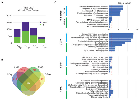 We observed desensitization in hMSN-like cells after 5 days of chronic dopamine dosing, similar to the length of administration in rodent models [,]. We next asked what the kinetics of gene expression changes and (de)sensitization were over time. We dosed hMSN-like cells with 1 mM dopamine once a day for five days and performed RNA-seq 1 h (DIV50) after each dose (Figure 4A and Figure S4, Dataset S6). We calculated the total number of DEGs over time and observed a peak on the third day of chronic dosing, which then dropped. We did observe a common set of genes that were differentially expressed at all time points (Figure 4B) and enriched for biological process GOs related to responses to stimuli and KEGG pathways such as MAPK signaling (Figure 4C). MAPK/ERK responses were observed prior to day 5, in agreement with our prior functional enrichment analysis of desensitized genes. However, despite this commonality, intriguingly, the nature of the response each day dynamically shifted. Genes unique to day 3 were related to the extracellular matrix organization and cell adhesion or morphogenesis. This then shifted, where day 4 was enriched for the nicotine addiction KEGG pathway, a pathway associated with nicotine-induced alterations in glutamatergic and GABAergic receptors (e.g., GRIN1 and GABRR2) on GABAergic MSNs []. By day 5, the expression profile had shifted yet again to cholesterol and fatty acid metabolism. It is notable that the number of DEGs peaked at day 3, with many genes not activating or repressing until multiple doses of dopamine were administered.