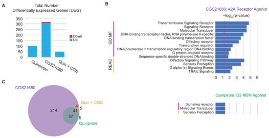 hMSN-like cells respond acutely to dopamine and exhibit desensitization to repeated exposures. However, one of the enduring challenges for MSN biology in rodents and humans is that MSNs exist as complex subtypes with multiple distinct receptors that may be expressed in many combinations [,,]. Furthermore, these receptors can have complex downstream cross interactions. For example, D2-like receptor expression is normally associated with ADORA2A expression in the same MSNs in vivo []. Furthermore, D2-like receptors inhibit the activity of adenylyl cyclase downstream of ADORA2A [,,]. We directly tested whether this crosstalk interaction between D2-like receptors and ADORA2A was maintained in human cells. We acutely and separately dosed DIV45 hMSN-like cells with the D2-like receptor agonist quinpirole and ADORA2A agonist CGS21680 (Figure 5 and Figure S5, Dataset S7). DEGs were the most abundant after dosage with CGS21680 (Figure 5A). CGS21680-induced DEGs were enriched for molecular function GO and reactome pathways related to G protein-coupled receptor signaling (Figure 5B), as expected for ADORA2A binding []. More interesting than the effects of individual agonists was when quinpirole and CGS21680 were added together. DEGs induced by quinpirole alone largely overlapped with those induced by CGS21680 alone (Figure 5C). However, preincubation with quinpirole an hour before the CGS21680 dosage negated the significant differential expression induced by CGS21680. This matches much of what is understood about D2-like receptors and ADORA2A. This result is also in alignment with previously studied interactions between the adenosine and dopamine systems []. This cross-interaction suggests that hMSN-like cells may be capable of capturing complex MSN signaling.