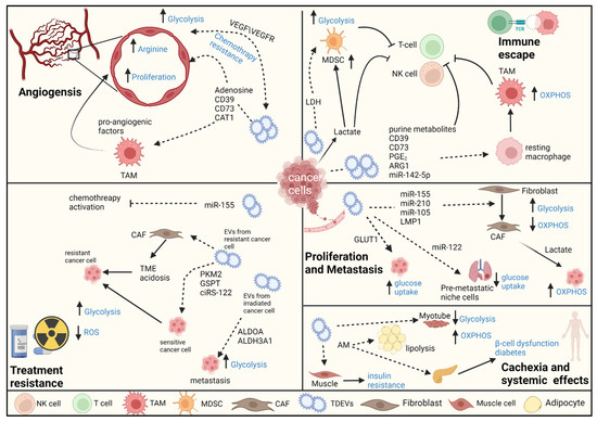 Tumor microenvironment metabolic reprogramming by tumor-derived extracellular vesicles. Tumor-derived EVs (TDEVs) have been implicated in almost all tumor aspects, including cell proliferation and metastasis, angiogenesis, immunoescape, and therapy resistance. TDEVs transfer cargo into endothelial cells that increase arginine metabolism and glycolysis, which promotes endothelial proliferation and angiogenesis. TDEVs transfer glycolytic enzymes and genetic material from treatment-resistant cancer cells to sensitive cancer cells, which thereby enhances glycolysis, causes a decrease in ROS, and increases chemotherapy metabolism, thus conferring treatment resistance. EVs carry and deliver purine metabolites, genetic material, and glycolytic enzymes that increase glycolysis in MDSC and polarize macrophages to TAMs, which, together with TDEVs, have a direct effect on inhibiting the immunoresponse to cancer. TDEVs activate fibroblasts to CAFs, which induces glycolysis in CAFs and, in turn, promotes proliferation and metastasis. TDEVs act on cancer cells to increase glucose uptake while suppressing glucose uptake by premetastatic niche cells, which promotes metastasis. TDEVs travel beyond the immediate TME to inhibit glycolysis and enhance OXPHOS in myoblasts, which disrupts myotube differentiation and partly explains cachexia. TDEVs induce insulin resistance in skeletal muscle cells and transfer AM to induce lipolysis and β-cell dysfunction, which is manifested as cancer-related diabetes. NK cell—natural killer cell; TAM—tumor-associated macrophage; MDSC—myeloid-derived suppressor cell; CAF—cancer-associated fibroblast; TME—tumor microenvironment; AM—adrenomedullin; ROS—reactive oxygen species; OXPHOS—oxidative phosphorylation. Dashed arrow—transferred EV cargo.
