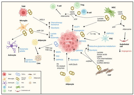 TDEVs have also been shown to affect and harness adipocytes for tumor progression. For example, breast cancer-derived EVs shuttled to resident adipocytes resulted in their conversion to cancer-associated adipocytes (CAAs). TDEVs induced beige/brown differentiation and reprogrammed metabolism in stromal adipocytes, which in turn altered tumor metabolism, specifically the accumulation of triglyceride and an increase in glucose uptake. This altered metabolism promoted tumor cell invasiveness in vitro [135].